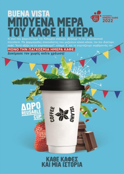 Στα Coffee Island, την Παγκόσμια Ημέρα του Καφέ μπορείτε να απολαύσετε τον limited edition καφέ Buena Vista από την Huila της Κολομβίας του καλλιεργητή Edwin Zambrano με ξηρή αναερόβια ζύμωση, κρεμώδες σώμα και αρωματικές νότες από μούρα, τροπικά φρούτα passion fruit και μέλι, σε ειδική τιμή και σε ποτήρια πολλαπλής χρήσης. Έτσι, θα έχετε την ευκαιρία να δοκιμάσετε specialty coffee μοναδικής ποιότητας ακριβώς στην ίδια τιμή που κοστίζουν καθημερινά τα ροφήματα Master Blend/Single Estate. Ταυτόχρονα, σημειώστε ότι μέχρι 2/10 στα δύο ροφήματα που θα παραγγείλετε, το ένα είναι δώρο (ισχύει στα ροφήματα 1+1 και σε επιλεγμένα καταστήματα).