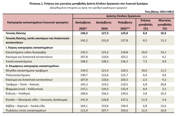 Ο Γενικός Δείκτης Κύκλου Εργασιών κατά τον μήνα Δεκέμβριο 2025, σε σύγκριση με τον αντίστοιχο δείκτη του Δεκεμβρίου 2024, παρουσίασε αύξηση 6,9% και σε σύγκριση με τον αντίστοιχο δείκτη του Νοεμβρίου 2025 άνοδο 10,3%, σύμφωνα με την ΕΛΣΤΑΤ.