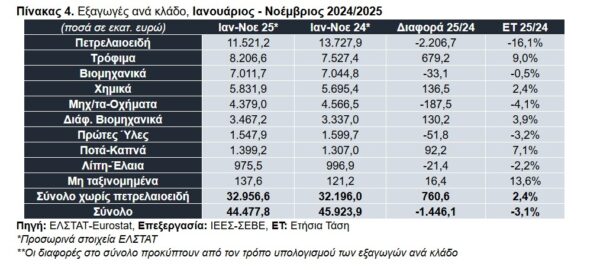 Αν εξαιρεθούν τα πετρελαιοειδή, οι εξαγωγές αγαθών κατά την περίοδο Ιανουαρίου–Νοεμβρίου 2025 ανήλθαν σε 33.835,5 εκατ. ευρώ, καταγράφοντας αύξηση κατά 700,3 εκατ. ευρώ ή 2,1% σε σύγκριση με την αντίστοιχη περίοδο του 2024, όταν είχαν διαμορφωθεί σε 33.135,2 εκατ. ευρώ.