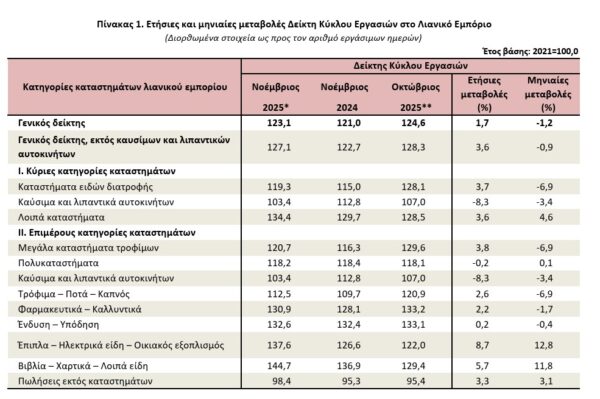 Αύξηση 1,7% σε ετήσια βάση, κατέγραψε τον Νοέμβριο 2025 ο Γενικός Δείκτης Κύκλου Εργασιών στο λιανεμπόριο και σε σύγκριση με τον αντίστοιχο δείκτη του Οκτωβρίου 2025, μείωση 1,2%, σύμφωνα με την ΕΛΣΤΑΤ.