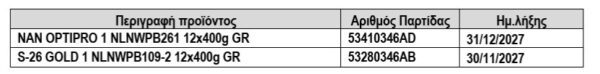 Οι παρακάτω παρτίδες είχαν αξιολογηθεί αρχικά και πληρούσαν τις προϋποθέσεις για την διάθεση τους στην αγορά. Η παρούσα Απόφαση εκδίδεται προληπτικά με σκοπό την ενίσχυση της εθελοντικής ανάκλησης της παραγωγού εταιρείας και εκτείνεται μέχρι το επίπεδο του καταναλωτή.