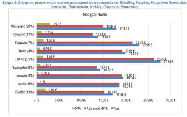 Αυτό, επισημαίνει η έρευνα, αποτυπώνεται χαρακτηριστικά, στην τιμή του μοσχαρίσιου κρέατος. Συγκεκριμένα, σύμφωνα με το ΙΕΛΚΑ, η Ελλάδα στο νωπό μοσχάρι, εμφανίζει μία από τις χαμηλότερες τιμές μεταξύ των χωρών που εξετάζονται – μόνο η Πορτογαλία και η Ρουμανία καταγράφουν χαμηλότερη τιμή. Ταυτόχρονα όμως έχει τον δεύτερο υψηλότερο ΦΠΑ, καθώς μαζί με τη Ρουμανία έχει το μοσχάρι στον μεσαίο συντελεστή ΦΠΑ και όχι στον χαμηλό ενώ μόνο η Βουλγαρία το έχει στον υψηλό συντελεστή ΦΠΑ.