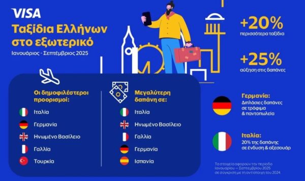 Σύμφωνα με στοιχεία της Visa, οι Έλληνες φαίνεται να προτιμούν κυρίως τους προορισμούς εντός Ευρώπης. Συγκεκριμένα, πάνω από το 80% των συνολικών διασυνοριακών δαπανών πραγματοποιούνται εντός του ΕΟΧ ενώ οι πέντε προορισμοί που επισκέπτονται συχνότερα οι Έλληνες είναι: Ιταλία, Γερμανία, Ηνωμένο Βασίλειο, Γαλλία, Τουρκία. Οι προορισμοί με τη μεγαλύτερη αύξηση ταξιδιωτών κατά το εννιάμηνο (Ιανουάριος – Σεπτέμβριος 2025), ήταν η Αίγυπτος με πάνω από 80% άνοδο και η Ιαπωνία με περίπου 70%. Ακολουθούν η Αλβανία, τα Ηνωμένα Αραβικά Εμιράτα και η Σλοβενία.