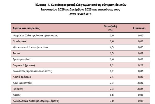 Ανοδικά κινήθηκαν οι τιμές σε αρκετές κατηγορίες τροφίμων από τον Δεκέμβριο του 2025 στον Ιανουάριο του 2026.