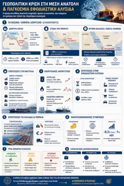 Συνολικά, η κρίση στη Μέση Ανατολή αναδεικνύει τα δομικά όρια της παγκοσμιοποιημένης οικονομίας και την ανάγκη για μεγαλύτερη ανθεκτικότητα στις εφοδιαστικές αλυσίδες. Το παγκόσμιο εμπορικό σύστημα, με «όχημα» την εφοδιαστική και τα logistics, κάθε φορά που συμβαίνει ένα γεγονός με τοπική, ή υπερτοπική σημασία, εισέρχεται σε μια φάση αναπροσαρμογής, όπου η ασφάλεια, η γεωπολιτική σταθερότητα και η διαφοροποίηση αποκτούν πλέον εξίσου σημαντικό ρόλο με την αποδοτικότητα και το χαμηλό κόστος. Και πάντα ο ρόλος της Εφοδιαστικής θα είναι κυρίαρχος και ρυθμιστής των εξελίξεων στο διεθνές εμπορικό πεδίο».